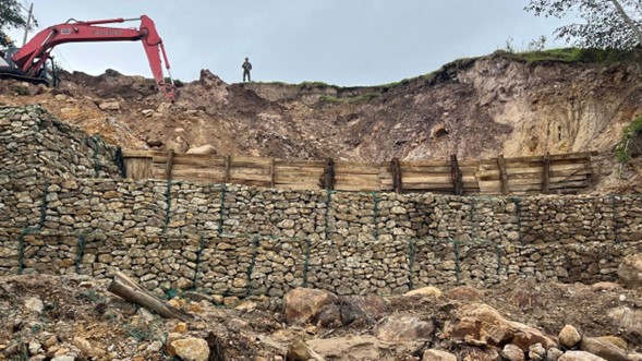 La obra incluyó la instalación de gaviones, junto con la implementación de 21 pilotes de concreto, trinchos en madera, terrazas, filtros vivos y cerramientos. Estas acciones integradas permiten una estabilización efectiva del talud, garantizando la protección del terreno y la reducción de riesgos a futuro.