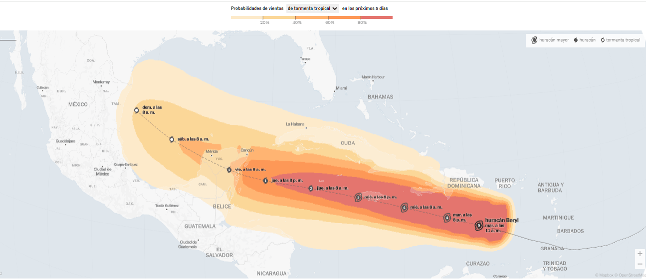 El Huracán Beryl se acerca al Caribe y este sería su paso por Colombia
